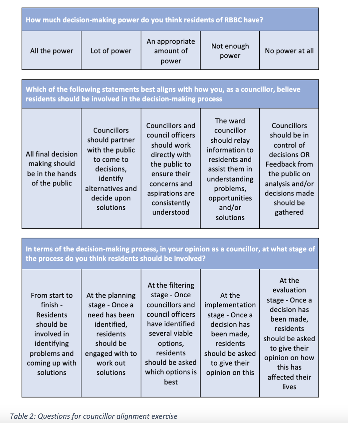 This was a very useful way of consolidating councillor feelings towards participation. It is important to have a baseline when looking to employ participatory methods where they have not been used before, especially in a political setting, so you can ascertain what additional work is needed to ensure councillors are comfortable with relinquishing power and increasing citizen voice.