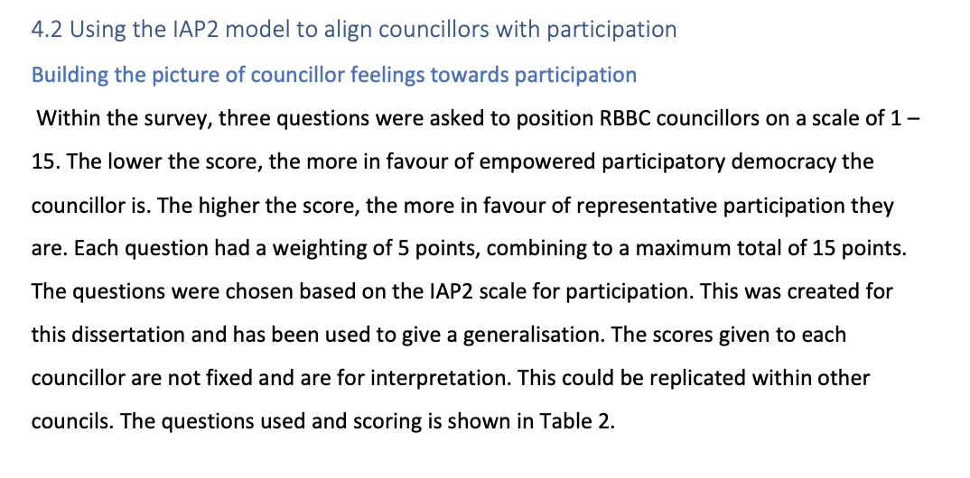 Using the IAP2 spectrum of participation councillors were surveyed to demonstrate whether they are in favour of participatory methods. This was for a masters dissertation looking to understand if local authorities in the UK have the right conditions to use participatory methods.