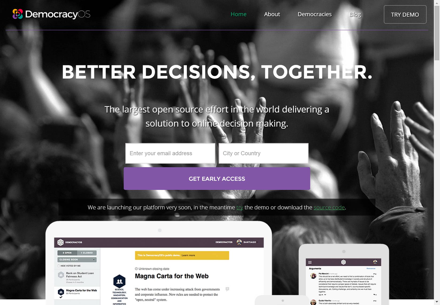 In April 2012, a group of activists, entrepreneurs, students and hackers got together in the city of Buenos Aires with a simple question in mind: What is democracy for the internet era? Many modern democracies still run the same way they did almost two centuries ago: citizens only get to interact with the political system once every few years. In an era where online access starts to become commonplace around the world, we are aware of how the internet changed the way we work, communicate and relate with each other. But politics and governments have changed little which is what this tool seeks to address.