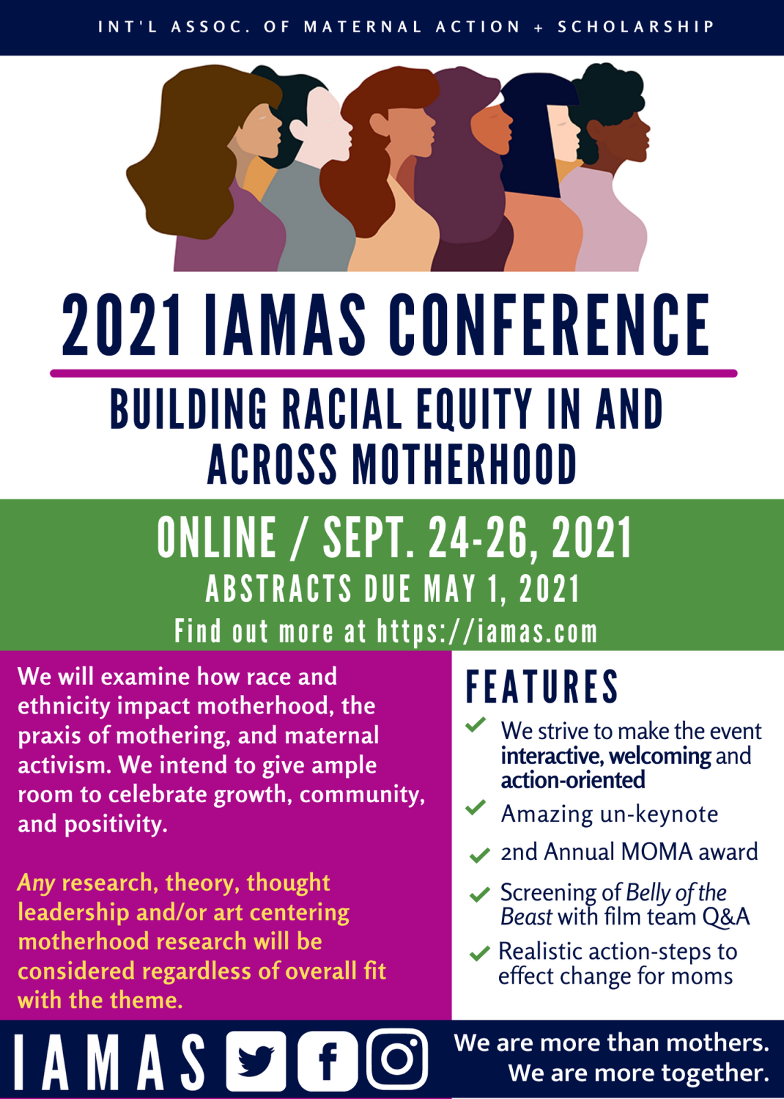 IAMAS’ roots are as an academic organization (formerly MIRCI), but their members are scholar-activists from dozens of countries who want to help all moms be their best selves by supporting mothers in academia, coordinating with other organizations that support maternal advocacy work, and shaping debates regarding the issues that matter most to mothers.